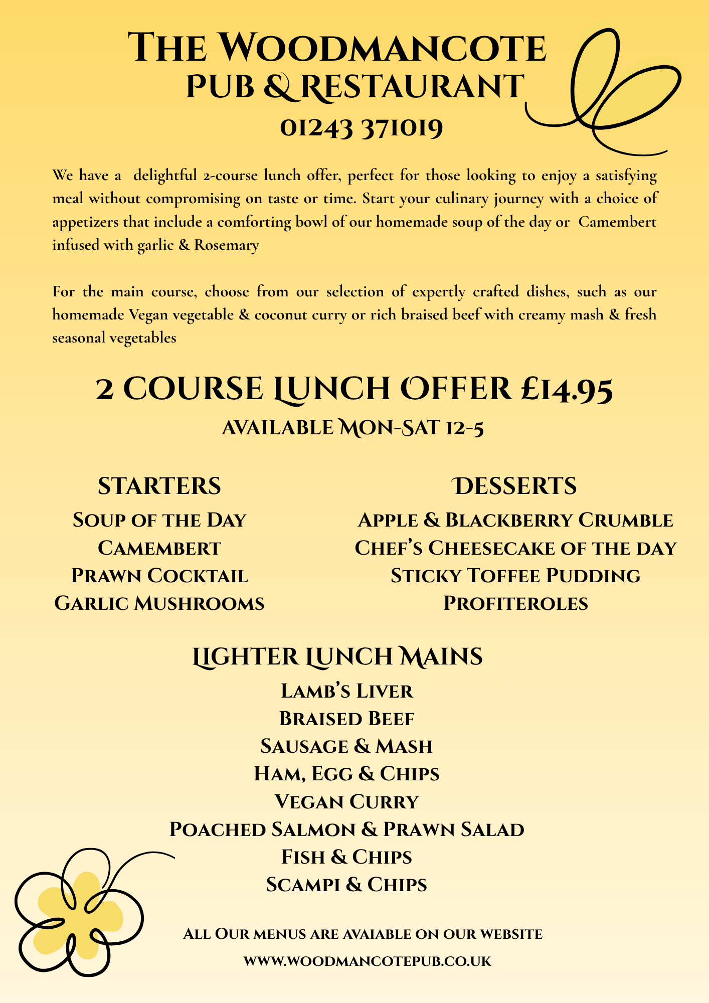 Enjoy our exclusive two-course lunch offer available Monday to Saturday from 12 to 5pm. Delight in our delicious meals that are great value!